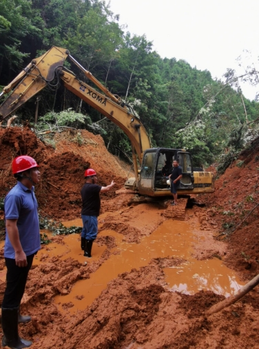 隨后,市政集團(tuán)搶險(xiǎn)救援突擊隊(duì)接到了搶修澄邦村村道的任務(wù),短短5公里3米寬的村道,每幾十米就有一個(gè)坍塌,大型的拖車無法將挖掘機(jī)運(yùn)送至村里進(jìn)行搶險(xiǎn)救災(zāi)。經(jīng)過突擊隊(duì)現(xiàn)場(chǎng)研究,制定了采用小型挖掘機(jī)一邊先行搶修道路一邊往澄邦村前行的方案,最后挖掘機(jī)用了5小時(shí)到達(dá)村里開始搶險(xiǎn)工作。